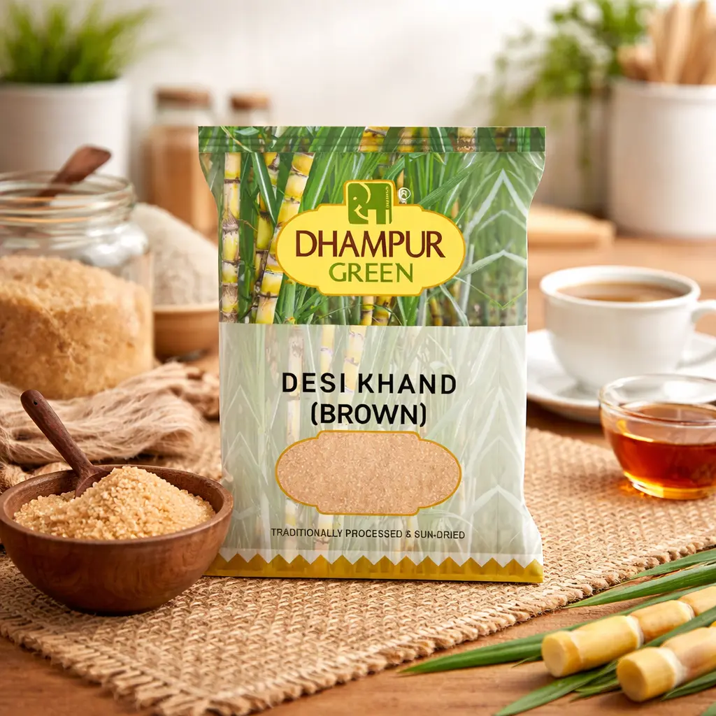 Brown Desi Khand is the kind of sugar that makes you question why you ever chose plain white sugar. It is traditional and authentic. The moment you use it in your chai or cooking, you notice the difference right away. Dhampur Green Desi Khand (Brown) is pure khandsari sugar; it is traditionally processed and sun-dried, without any coloring agents, chemicals, preservatives, or artificial additives. What you see in the pack is exactly what sugarcane juice turns into when it is handled properly and allowed to remain natural.